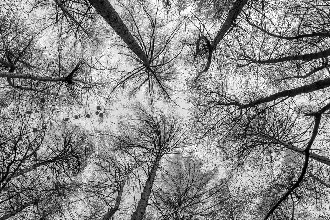 Wherever I am I seek out the peace and solitude of woods and forests. I marvel at the rhythmic shapes and patterns. Branches interlock like fingers, the larger ones resembling arms. Each tree is an individual as unique and different to one another as humans. These photos demonstrate the delicate balance of light and shade created by the leaves and branches in harmony with a background of water, land and sky. They convey my awe at the grace and beauty of the extraordinary and fascinating design of nature. This series of fine etching like images invites us to experience and pay tribute to the value and appearance of gatherings of trees, enabling us to understand their connectivity and communication